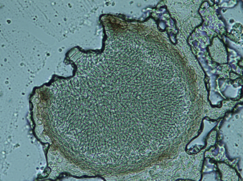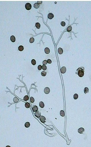 植物病原自主诊断学习系统形态特征:孢囊梗二叉状锐角分枝,末端膨大呈盘状。代表性病害:菊科植物莴苣霜霉病。
