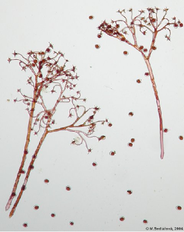形态特征:孢囊梗二叉状锐角分枝,末端膨大呈盘状。代表性病害:菊科植物莴苣霜霉病。